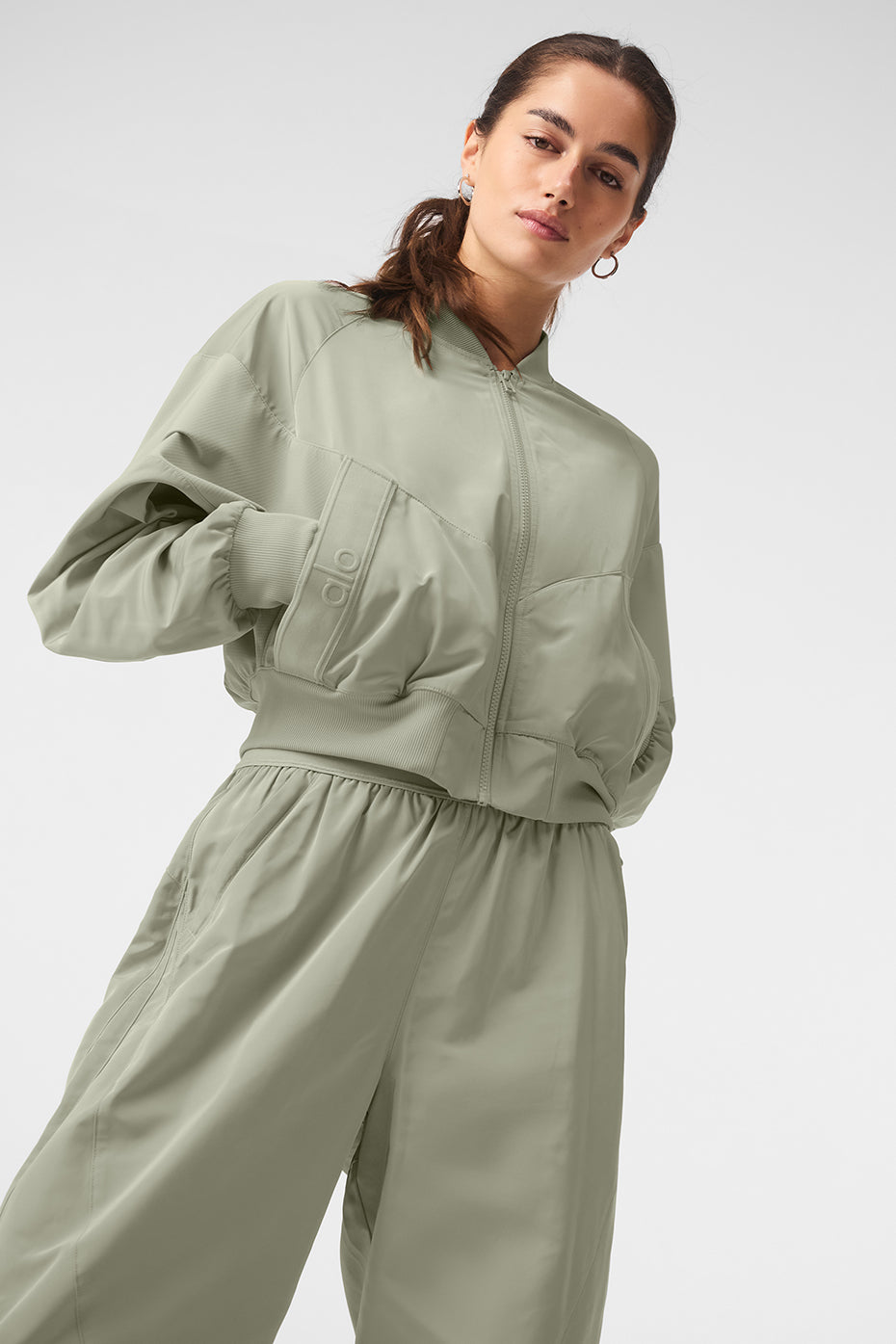 Done in a soft, swishy fabric with subtly contrasting panels, this bomber jacket is, well… the bomb. It has dropped shoulders, a full-zip front and ribbing at the cuffs and hem. Details like a cargo pocket on the arm and Alo straps on the pockets complete the sporty vibe. Pair it with a sports bra, the matching joggers and sneakers for an easy and effortlessly cool outfit.