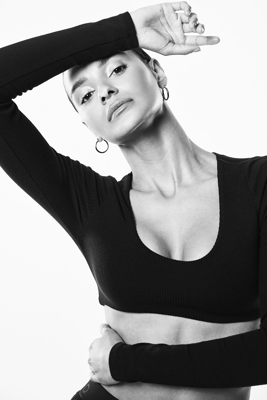 OM-M-G this. Too-cute Ribbed Defined Long Sleeve Bra is it. A tiny cropped bra top, with removable cups and a scoop neck—all in comfy Wellness ribbed fabric. We’ll be wearing it with flared leggings.