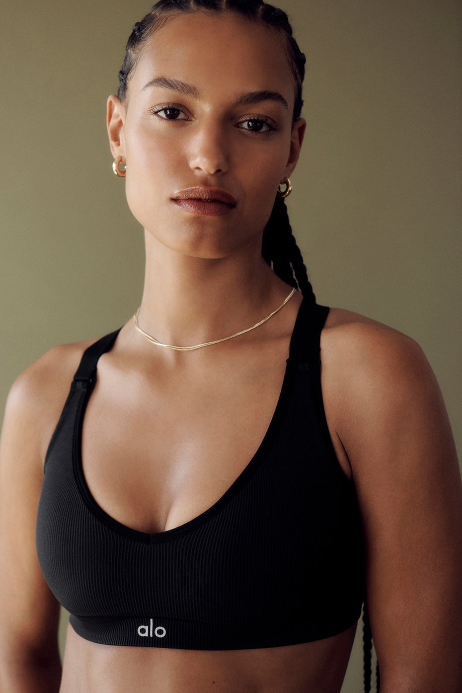 Cute and comfy with a perfect fit and practical details, this bra is made from our signature Seamless Ribbed fabric for a snug, slightly compressive feel. The adjustable straps can be worn crisscrossed or straight, and the back features a stay-put hook-and-eye closure. More to love: The subtle V-neck and the fact that it goes with everything in your activewear rotation.