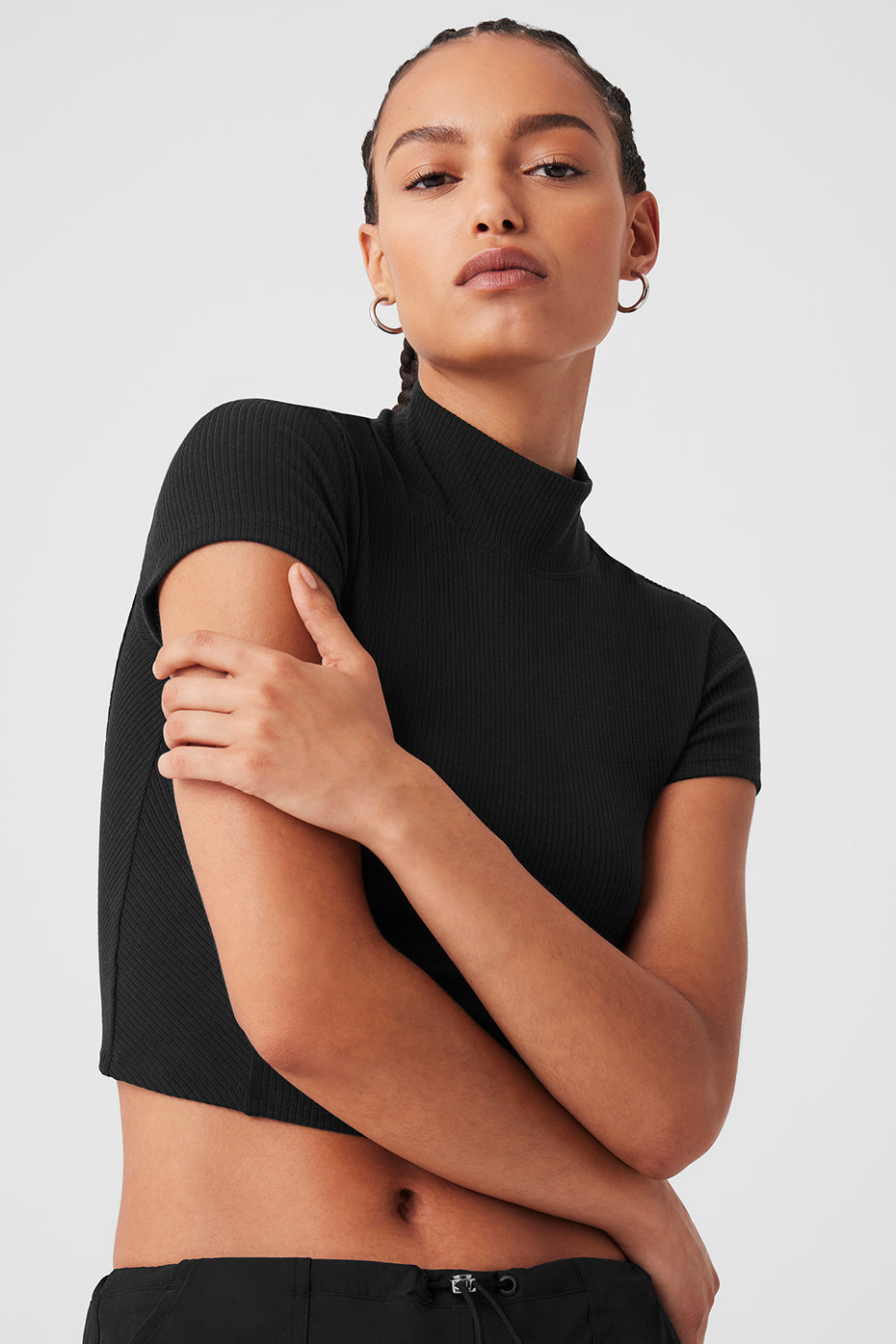 Wellness Rib Mock Neck Polished Short Sleeve - Black