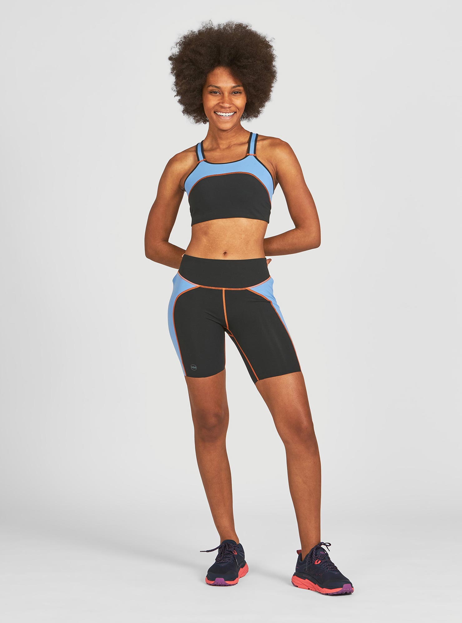 Ergonomic waistband design contours the hips for optimal comfort in stride while power mesh lining offers secure support